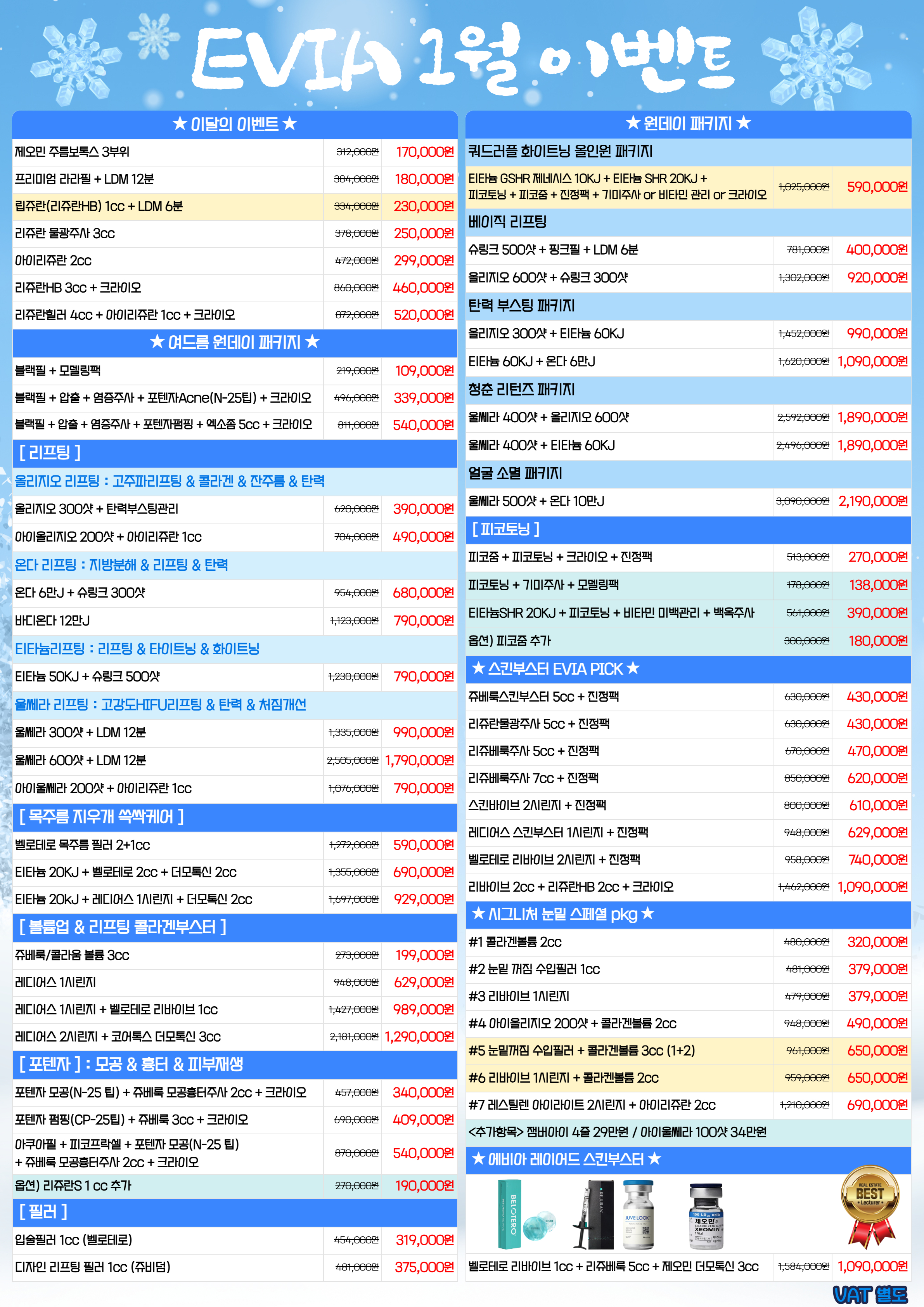 *모든 시술가격은 부가세(VAT 10%) 별도입니다. *이벤트는 사전통지 없이 가격이나 내용이 변경될 수 있습니다.